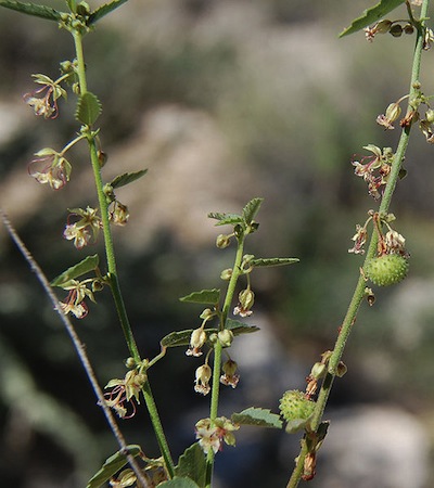 Description: Desert Ayenia has single to multiple stems extending straight up from the base of the taproot. Leaves are oblong to blade-like with serrated edges. Flowers protrude from the nodes of the stem. Petals are less than a 1/4 inch in size. Fruits are round and tan in color with light purple pubescence.