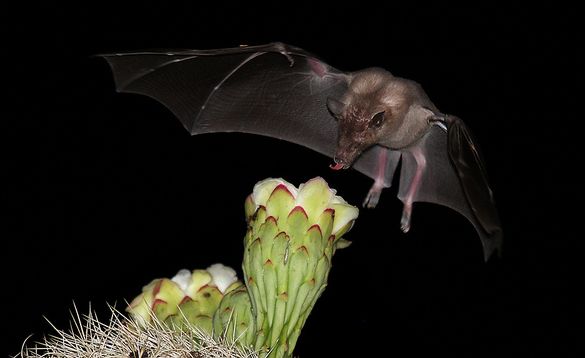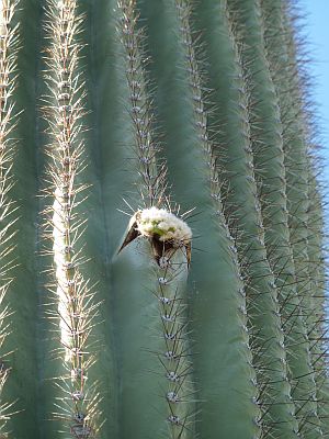 In the Tucson area, saguaros flower in May-June. Each flower lasts but a single day. It opens at night and remains open for part of the next day. It cannot pollinate itself, so it must get pollen from another individual. Pollen transfer is accomplished by long-nosed bats and white-winged doves and bees which visit the flowers to obtain nectar. In the Sonoran Desert, the two vertebrate pollinators migrate to our area in synchrony with the sagauro flowering season. Other species such as gilded flickers also help to pollinate the flowers.