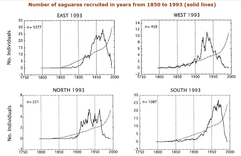 The figure above shows saguaro recruitment in the four Tumamoc Hill subplots from 1850 to 1993. There is a sharp peak in recruitment in the East Plot from 1940 through 1970; there is one in the West Plot from 1920 through 1960; there is one in the North Plot from 1910 through 1970; and there is one in the South Plot from 1940 through 1970. |